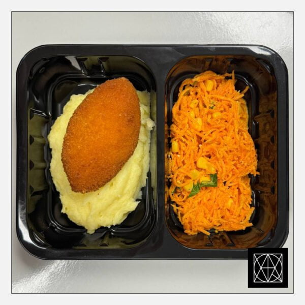 Kijevo kotletas, pateikiamas su sviestine bulvių koše ir morkų salotomis, gardintomis majonezu ir kukurūzais