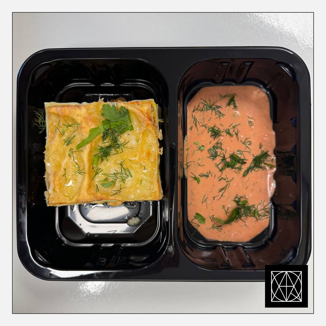 Lazanija su kalakutiena, pagardinta paprikomis ir pomidorais, užkepta kietuoju sūriu, pateikiama su pikantišku padažu