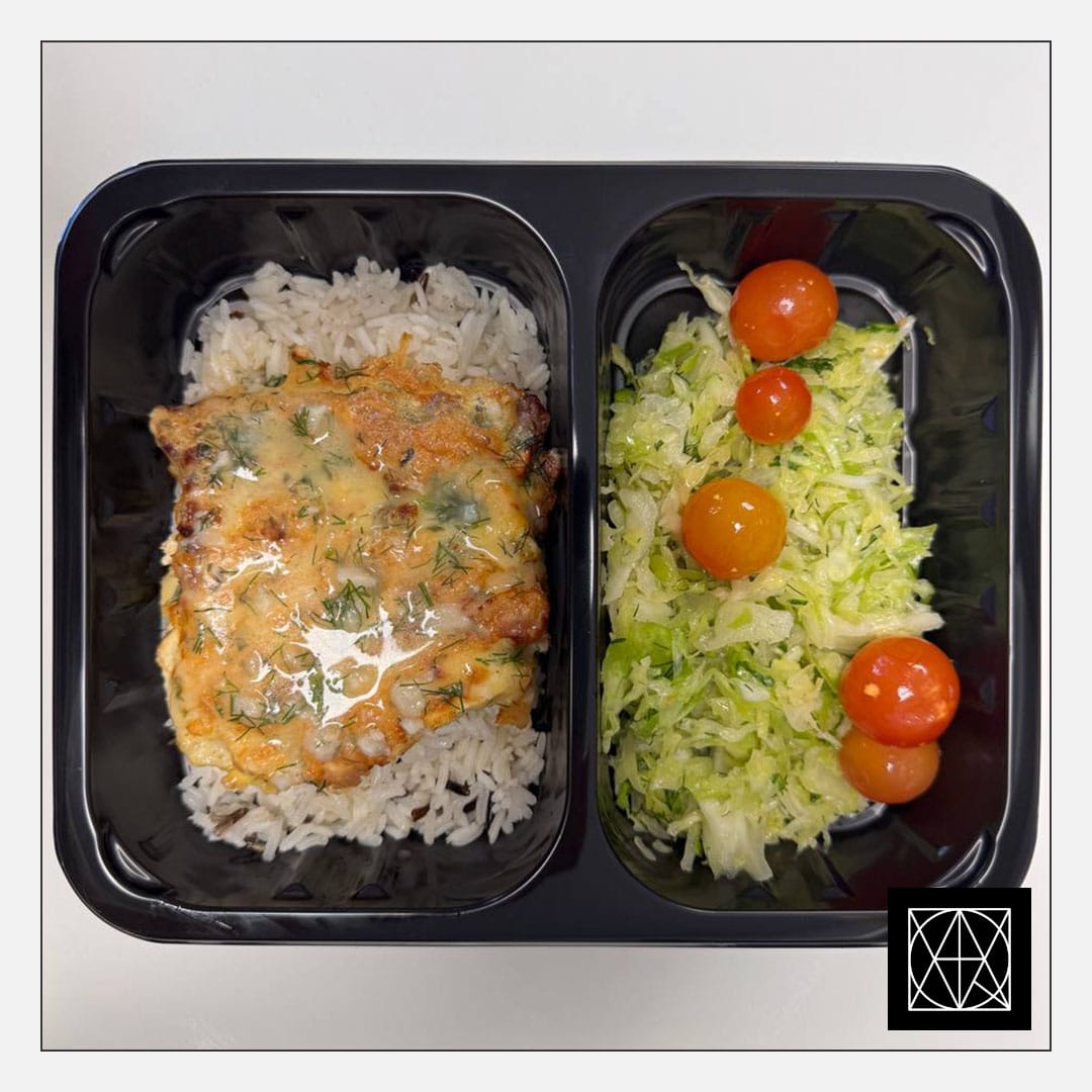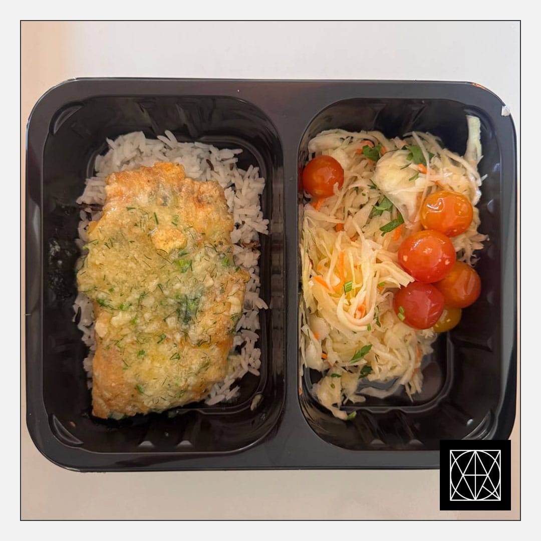 Ledjūrio menkė, gardinta česnakiniu sviestu ir žalumynais, pateikiama su laukiniais ryžiais ir kopūstų salotomis, gardintomis fermentuotais vyšniniais pomidorais