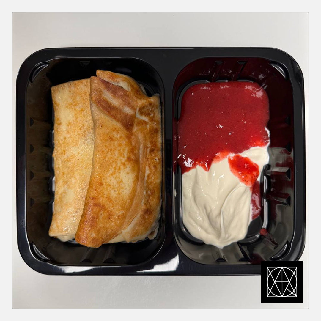 produkto kiekis: Lietiniai blynai su varške ir bananais, pateikiami su trintomis braškėmis ir grietine
