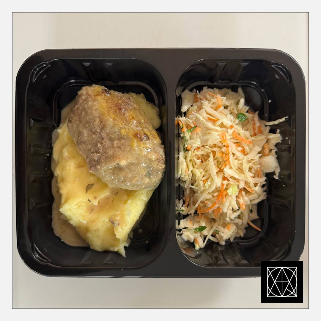 Maltos jautienos šnicelis, pateikiamas su bulvių koše ir morkų-kopūstų salotomis, gardintomis majonezu