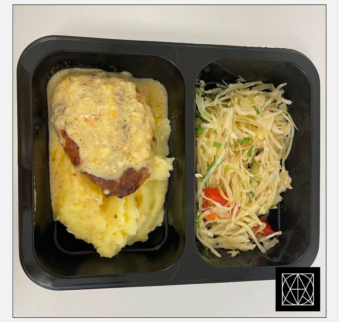 Maltos kiaulienos šnicelis su sūrio padažu, pateikiamas su bulvių koše ir kopūstų salotomis, gardintomis pomidorais