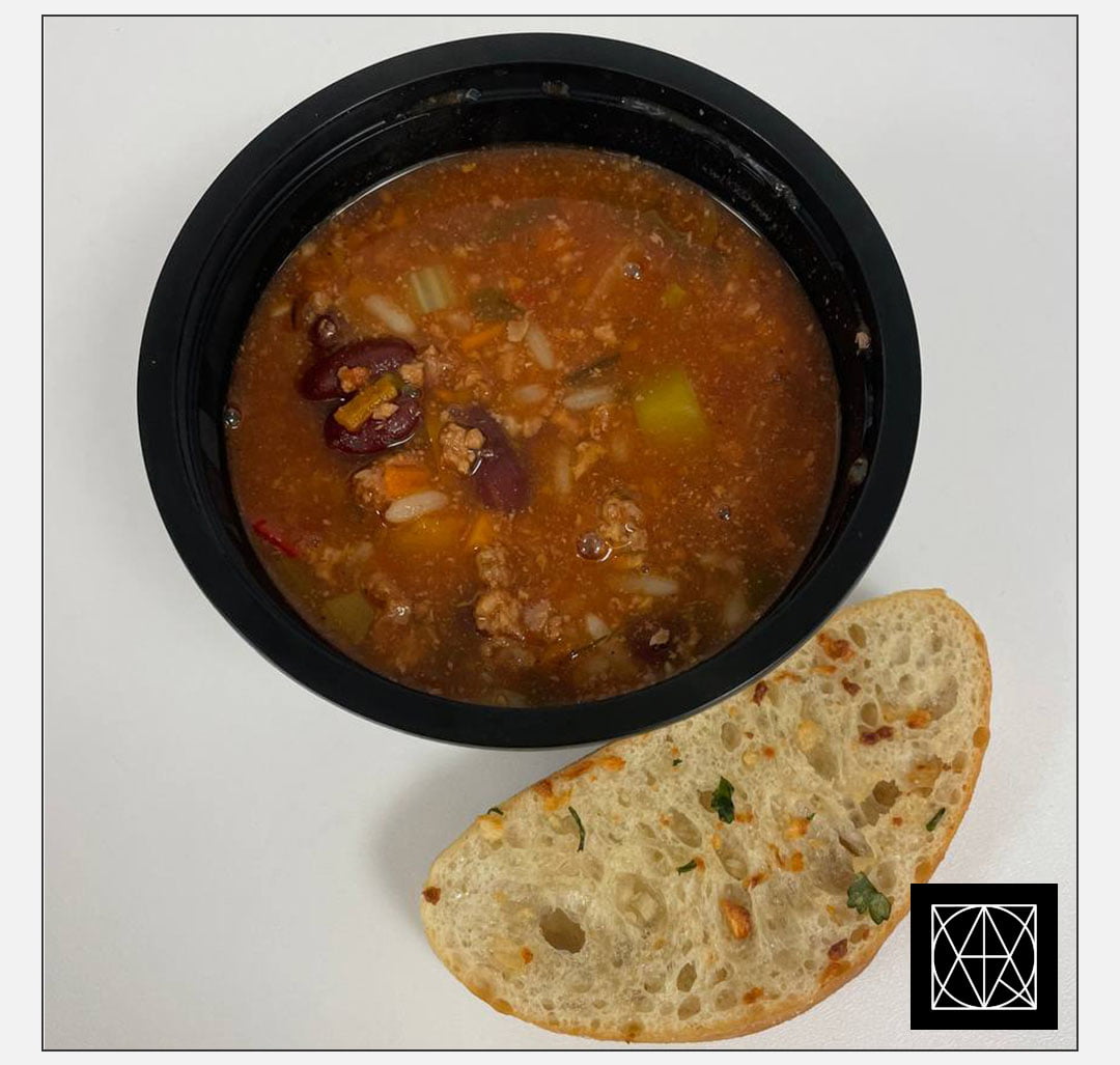 Meksikietiška jautienos sriuba su pupelėmis, pateikiama su skrudinta česnakine duona