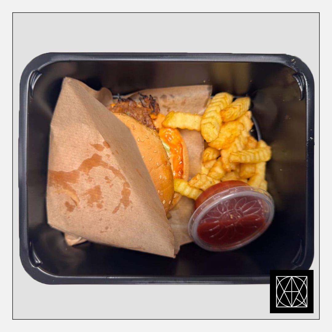 produkto kiekis: Mėsainis su plėšyta kiauliena, marinuotais agurkais, pomidorais, salotų lapais, svogūnais, čederio sūriu, česnakiniu majonezo-teriyaki padažu ir gruzdintomis bulvytėmis