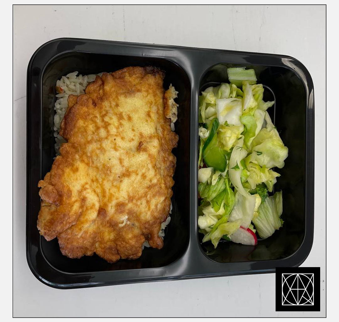 Muštos vištienos kepsnys, pateikiamas su ryžiais ir šviežiomis salotomis