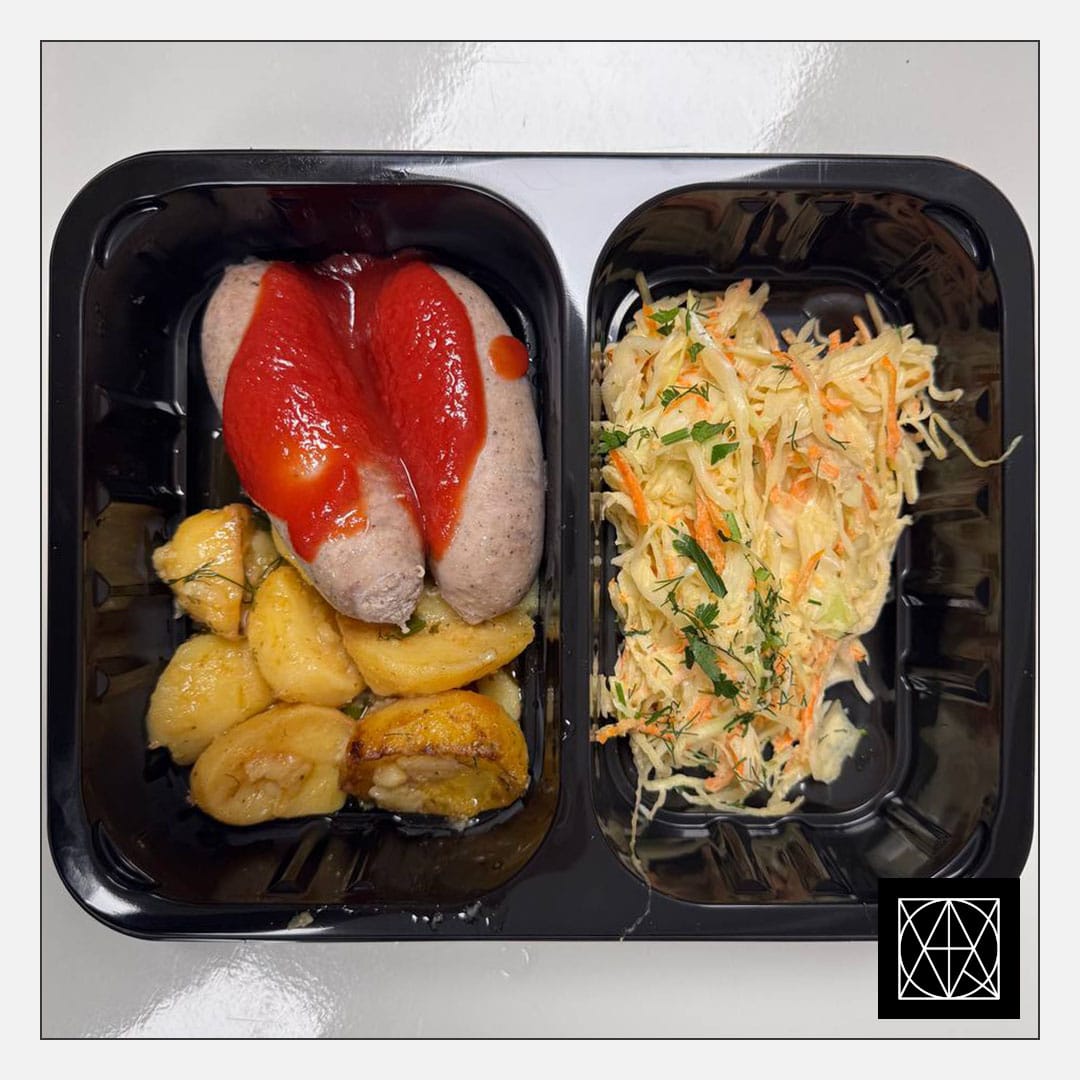 Naminės kiaulienos dešrelės su pomidorų padažu, pateikiamos su keptomis bulvėmis ir kopūstų salotomis, gardintomis majonezu