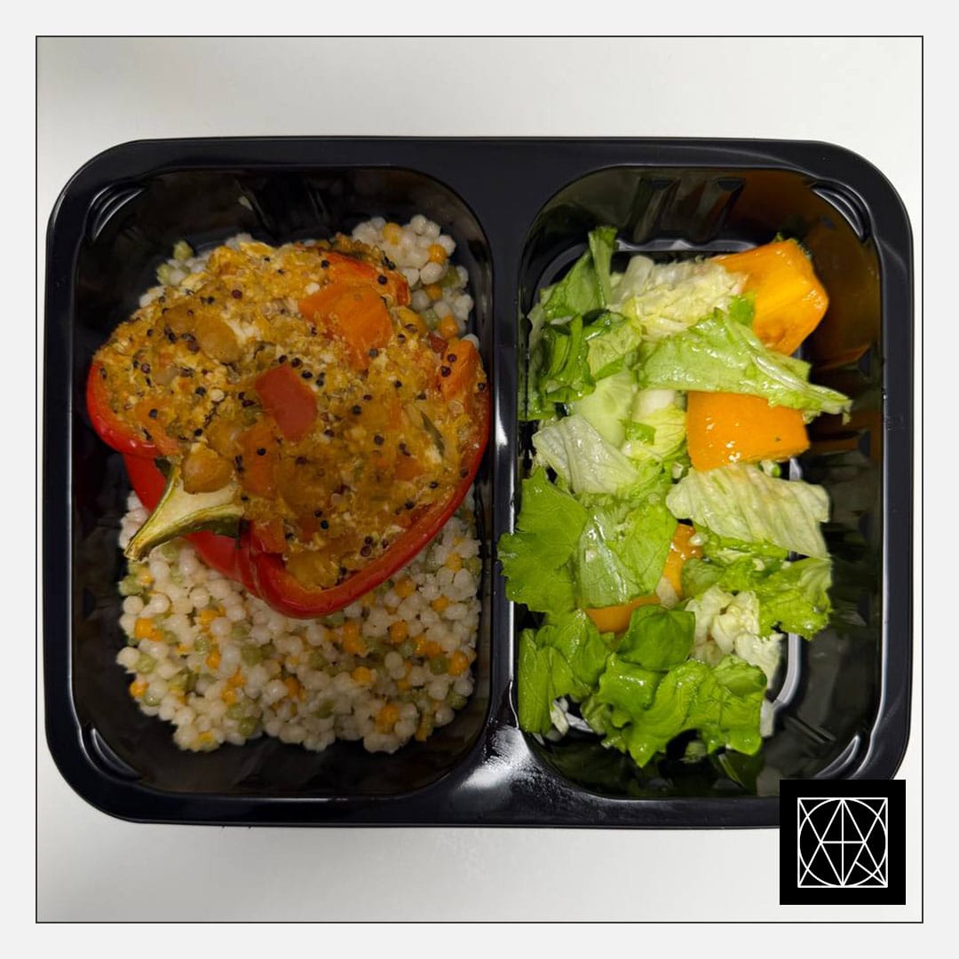 produkto kiekis: Paprika, įdaryta bolivinėmis balandomis, daržovėmis ir tofu, pateikiama su šviežiomis salotomis