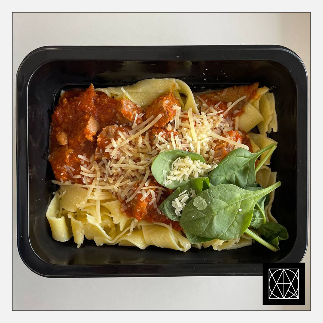 Pilno grūdo makaronai „Pappardelle“ su mėsos padažu alla Genovese – jautiena, salierais, morkomis, džiovintais baravykais, graikiškais riešutais ir pomidorų padažu
