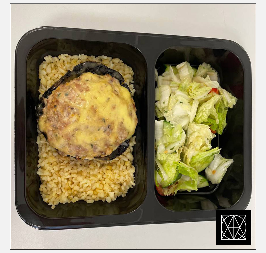 Portobelo grybas, įdarytas kalakutiena, pateikiamas su bulguru ir šviežiomis salotomis