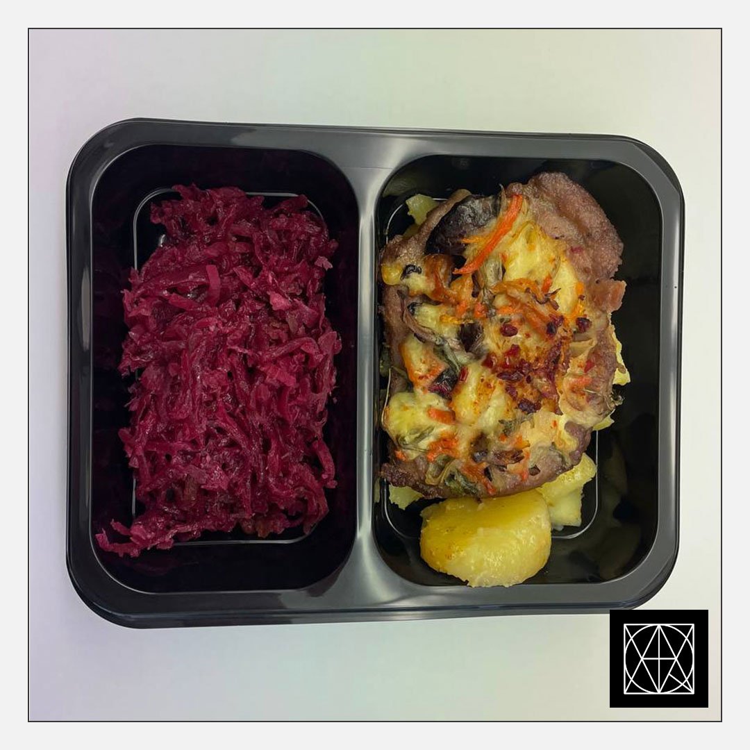 Prancūziškas kiaulienos kepsnys, užkeptas svogūnais, morkomis, rudaisiais pievagrybiais ir sūriu, pateikiamas su keptomis bulvėmis ir fermentuotais burokėliais