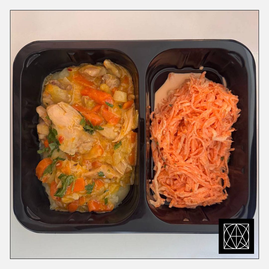 Saldžiai aštrus vištienos troškinys su morkomis, pateikiamas su bulvių koše ir morkų salotomis, gardintomis baltaisiais ridikais