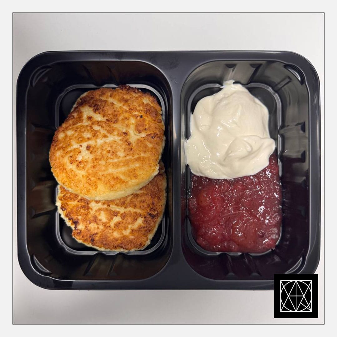 produkto kiekis: Saldžios varškės kepti varškėčiai, pateikiami su namine uogiene ir grietine