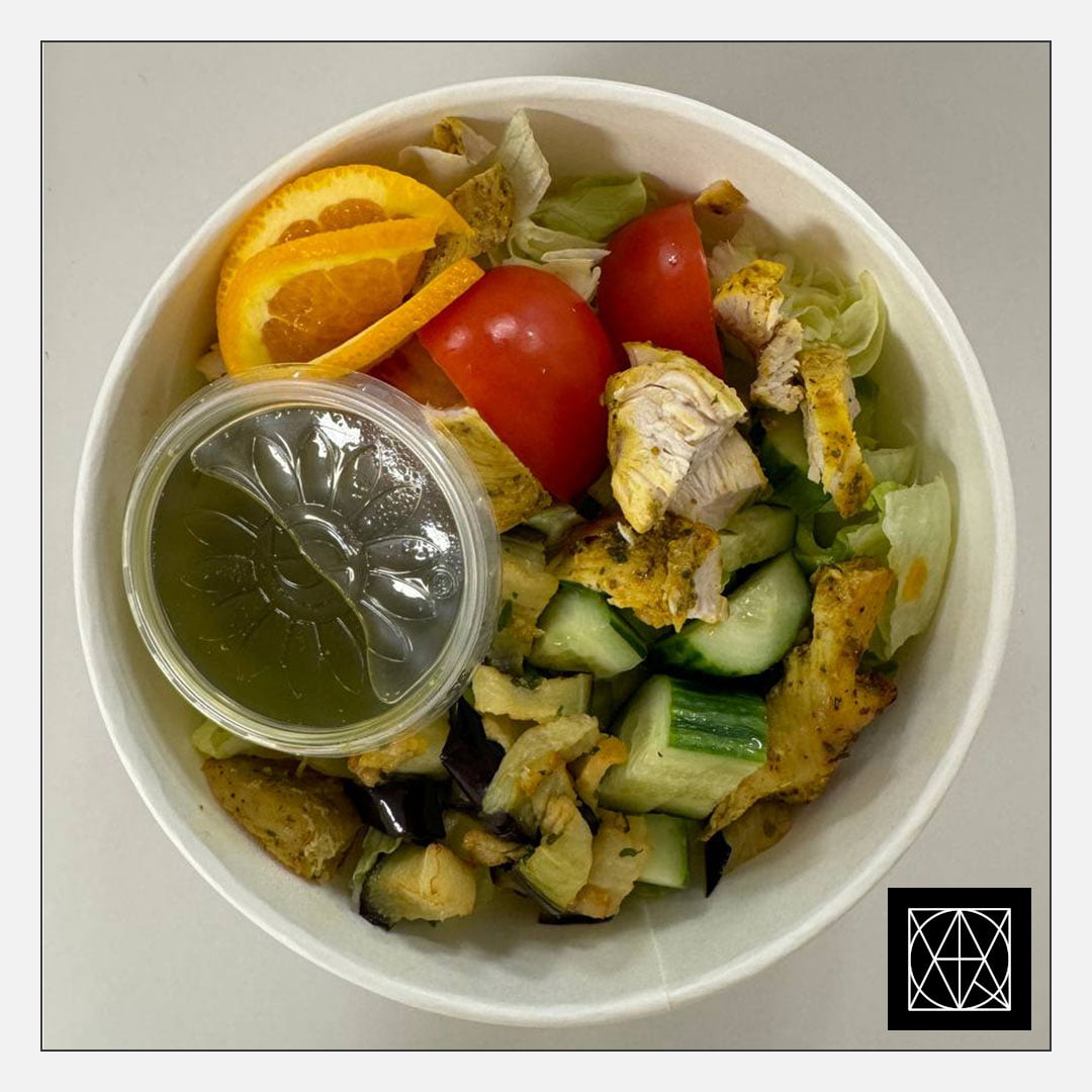 Salotos su kepta vištiena, agurkais ir keptu baklažanu, pagardintos apelsinu ir pesto padažu