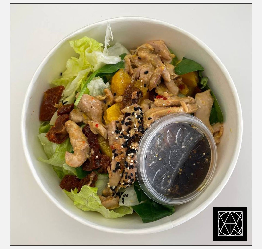 Salotos su kepta vištiena, apelsinais, džiovintais pomidorais, pagardintos medaus-citrinų padažu
