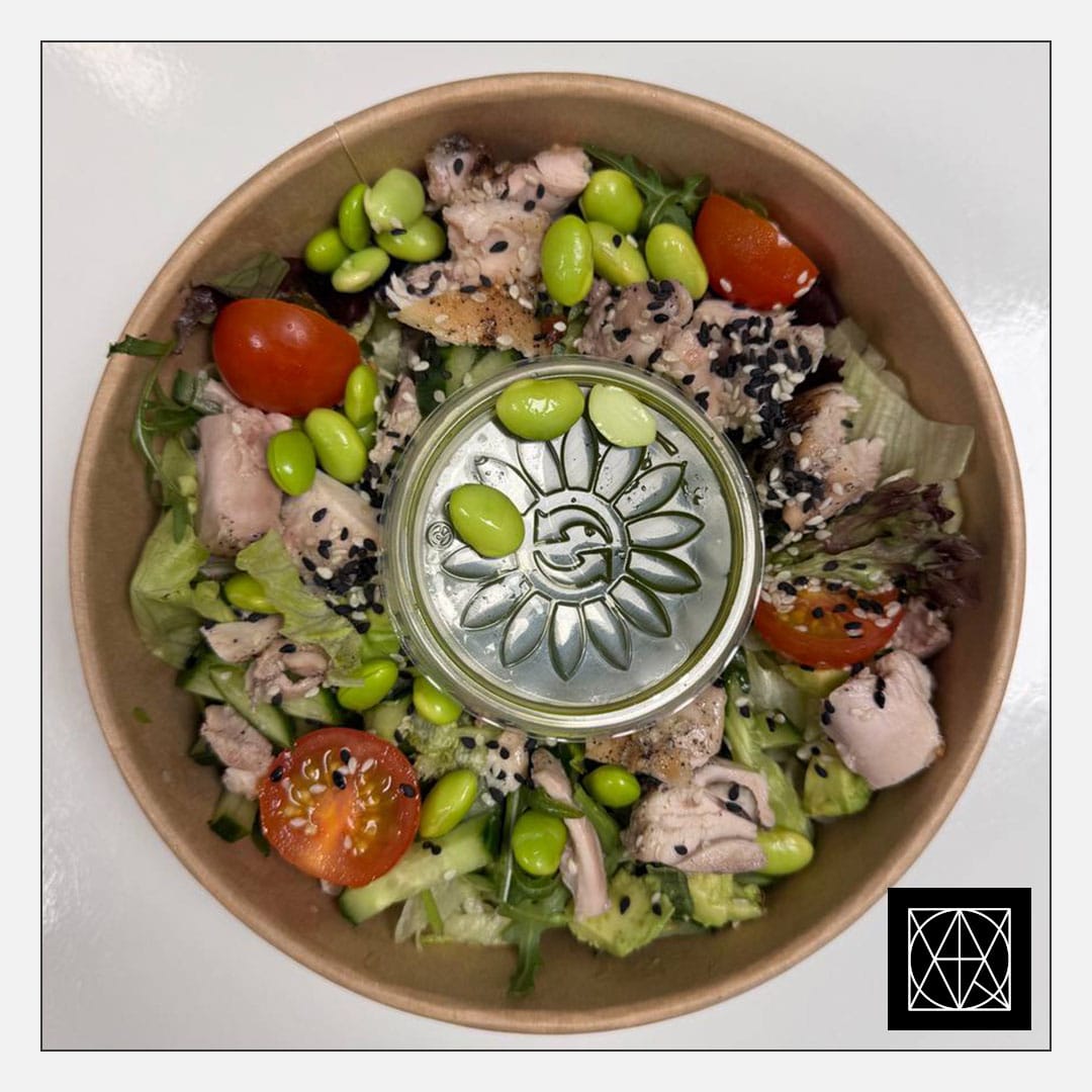 Salotos su kepta vištiena, edamame pupelėmis, agurkais, avokadu, vyšniniais pomidorais ir pesto padažu