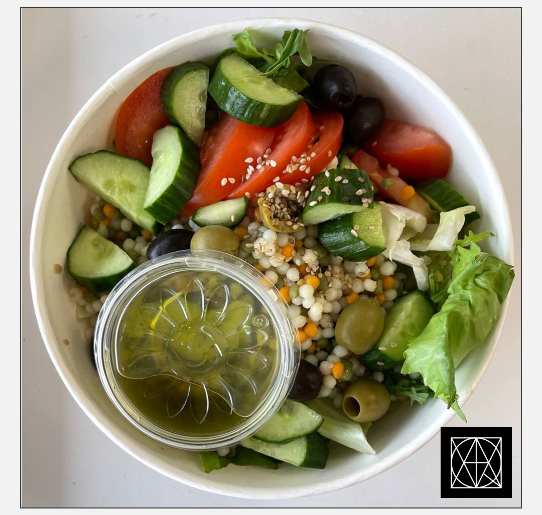 Šaltos perlinio kuskuso salotos su pomidorais, alyvuogėmis ir agurkais, pagardintos žalumynais