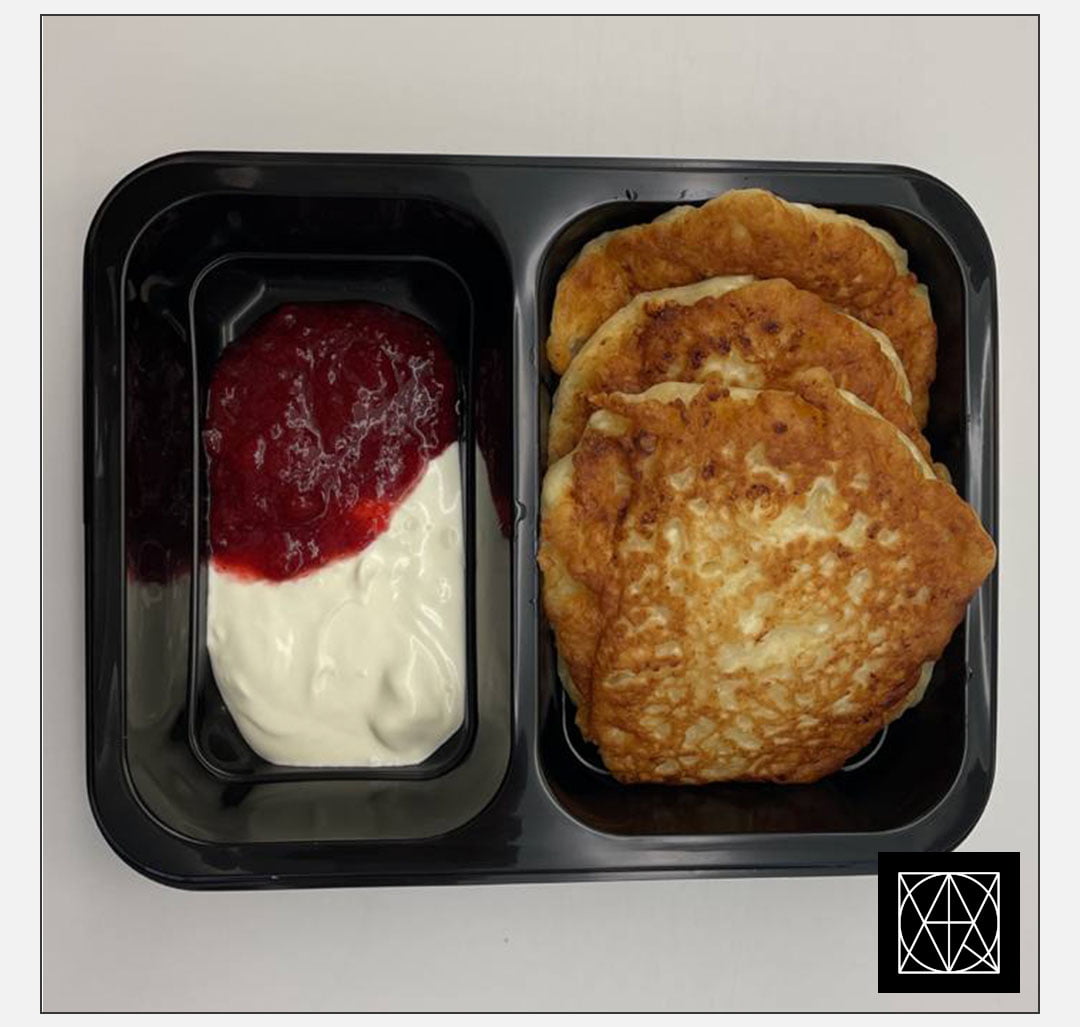 Sklindžiai su varške, pateikiami su braškių uogiene ir grietine