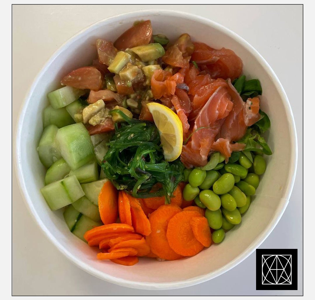 Smoked Salmon Poke Bowl – rūkyta lašiša, ryžiai, edamame pupelės, morkos, agurkai, avokado-pomidorų kapotinis, sezamo sėklos