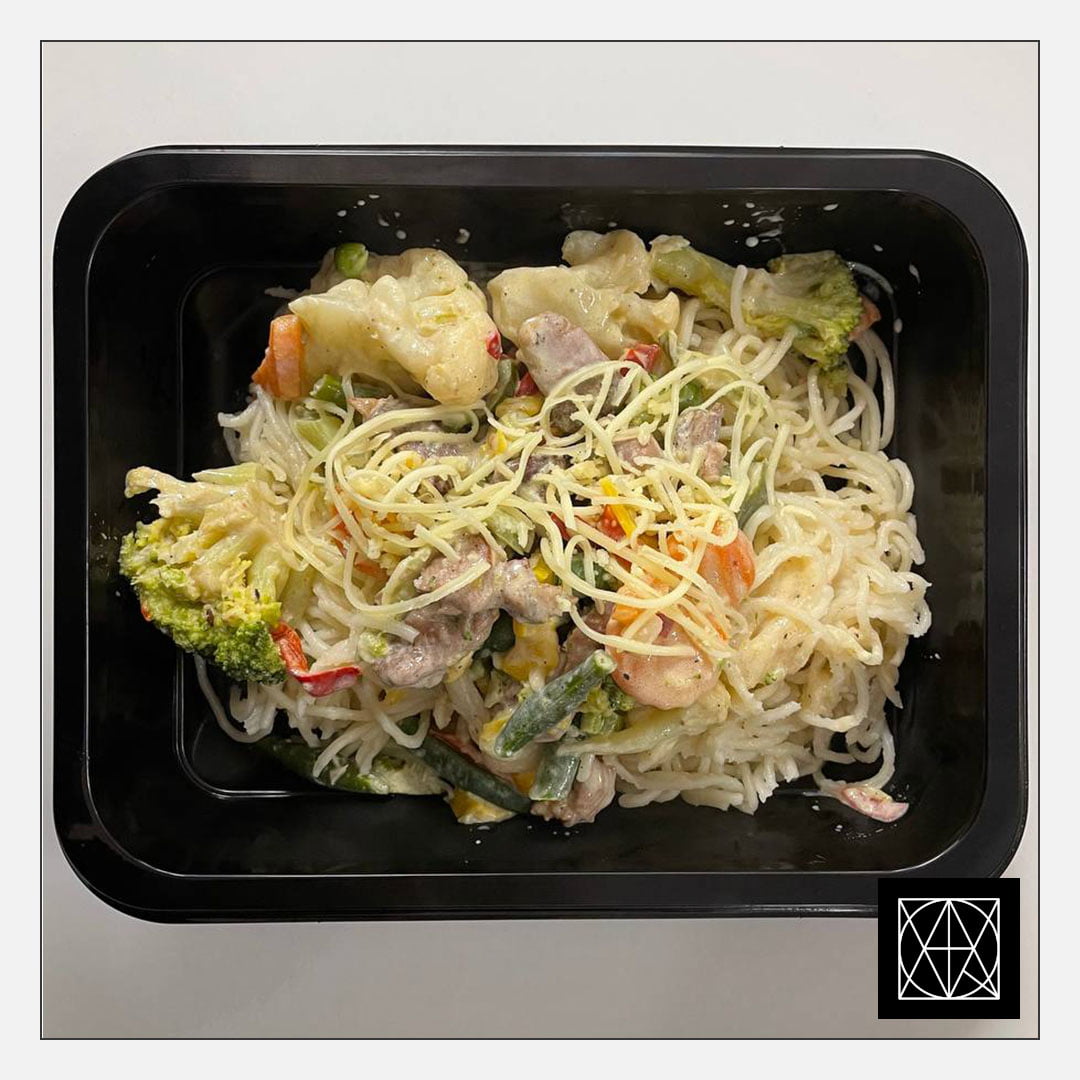 „Spaghetti“ makaronai su kalakutiena, brokoliais ir saldžiąja paprika, pagardinta grietinėlės padažu ir sūriu
