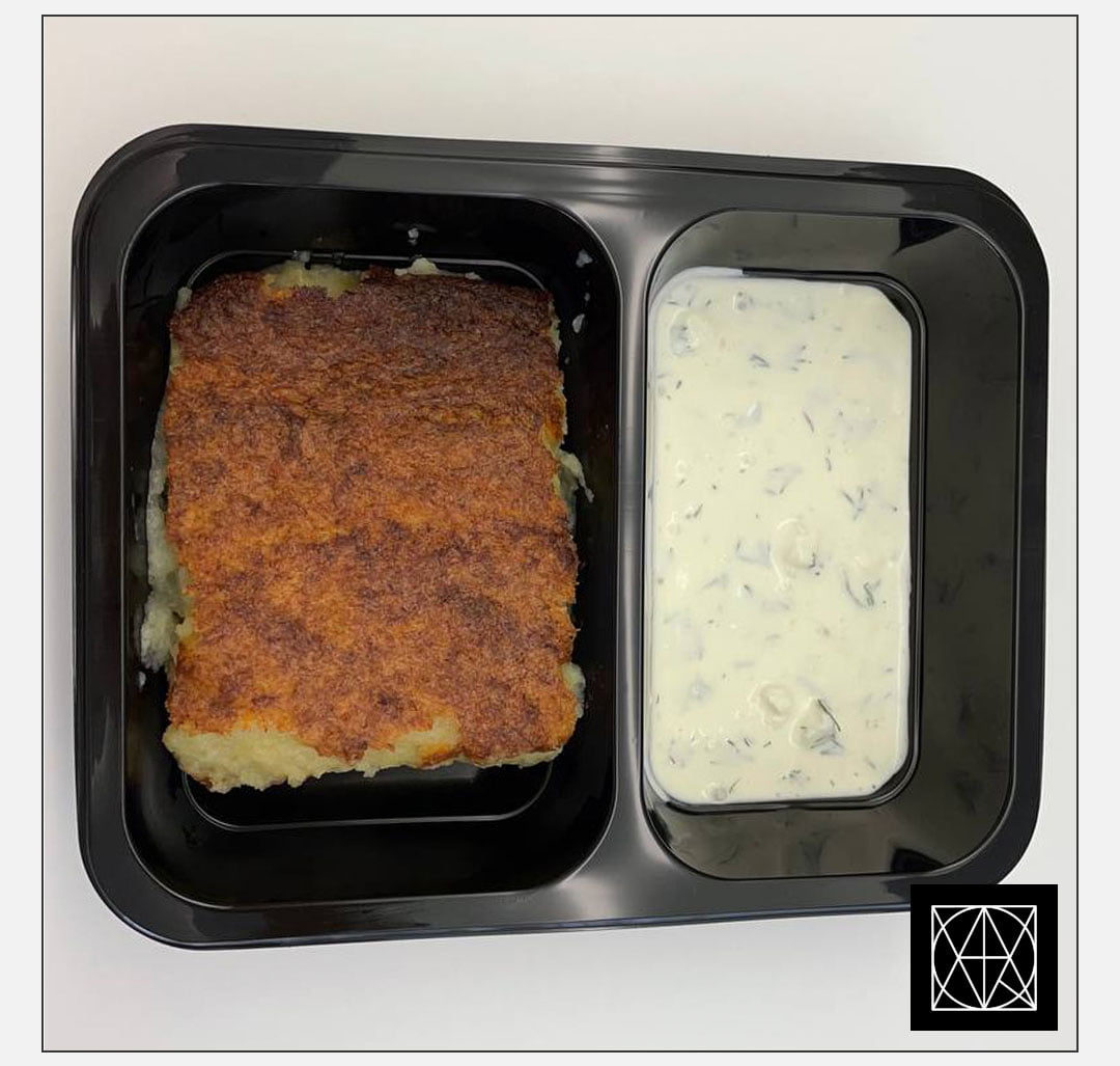 Šviežių bulvių plokštainis su varškės padažu, gardintu žolelėmis