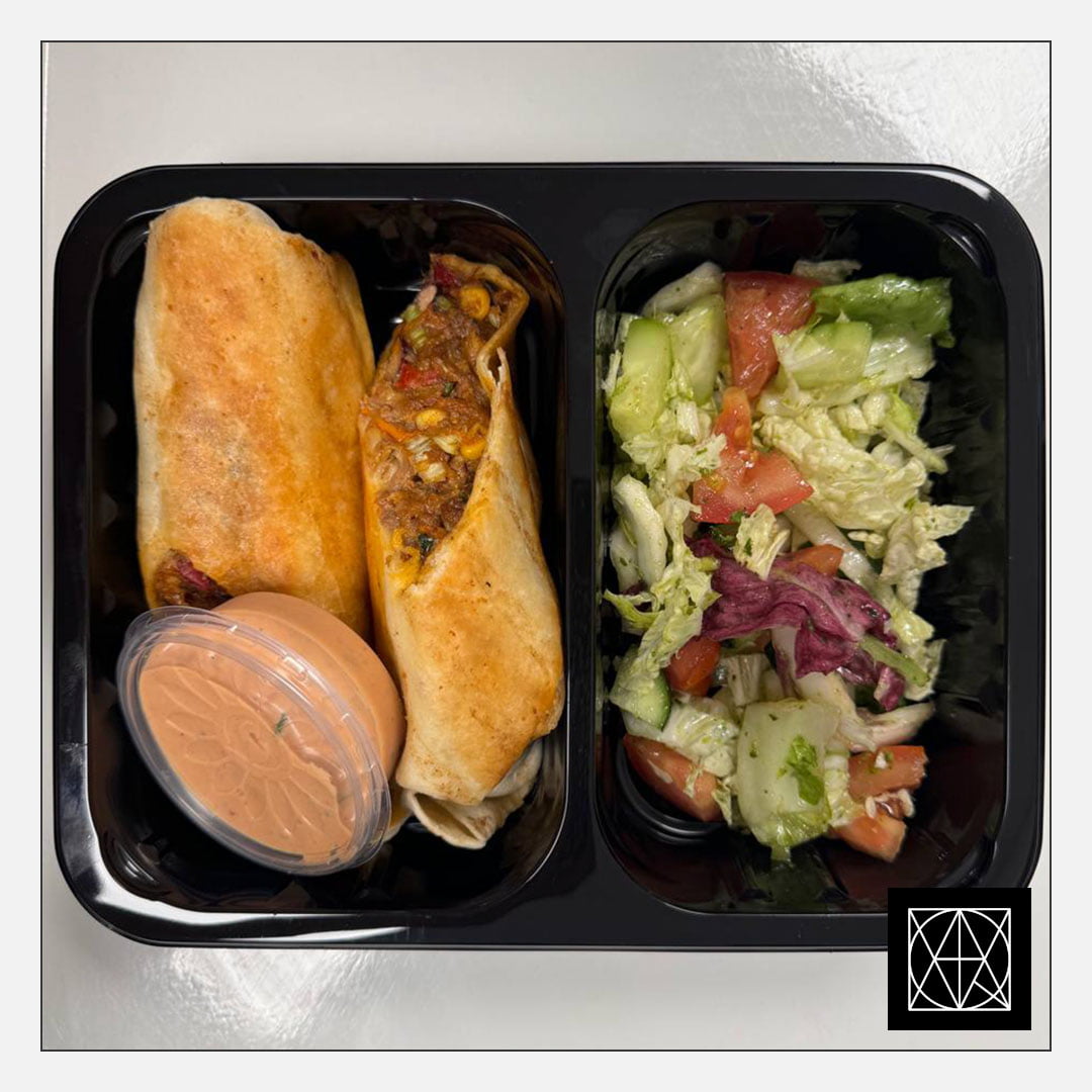 Tortilija su plėšyta jautiena, gardinta meksikietiškais pipirais, mocarela, paprika, cukinija, svogūnais, pateikiama su saldžiai aštriu padažu ir šviežiomis salotomis