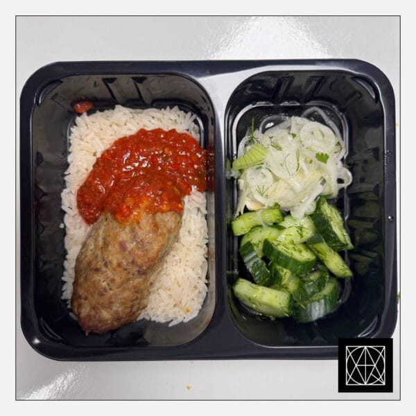 Trijų mėsų liuliakebabas su namine adžika, tortilija, ryžiais, marinuotais svogūnais ir šviežiai raugintais agurkais