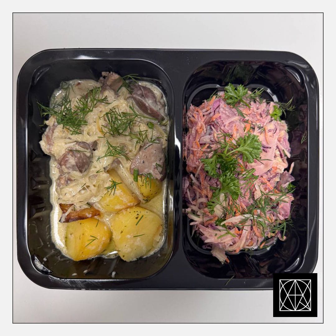 Troškintos vištienos kepenėlės grietinėlės-svogūnų padaže, pateikiamos su keptomis bulvėmis ir „Coleslaw“ salotomis