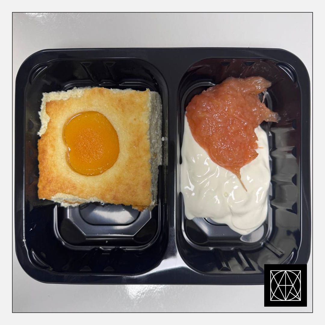 Varškės apkepas su persikais, pateikiamas su namine uogiene ir grietine