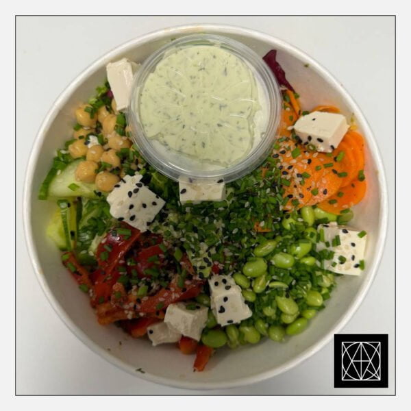 Vegan Poke Bowl – bolivinė balanda, tofu, agurkai, morkos, marinuota paprika, avinžirniai, edamame pupelės, avokadas, laiškiniai svogūnai, tzatziki padažas, sezamų sėklos