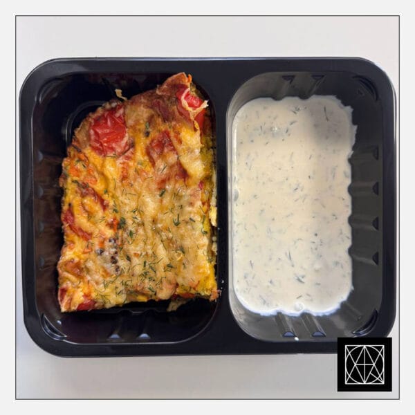 Vegetariškas daržovių omletas, gardintas kietuoju sūriu, pateikiamas su jogurtiniu padažu