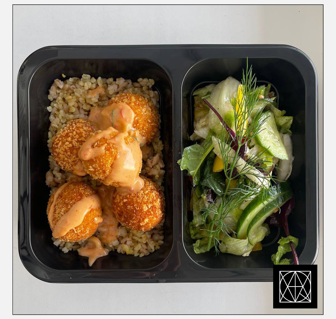 Vegetariški daržovių falafeliai su libanietišku jogurtiniu padažu, pateikiami su bulguru ir šviežiomis salotomis