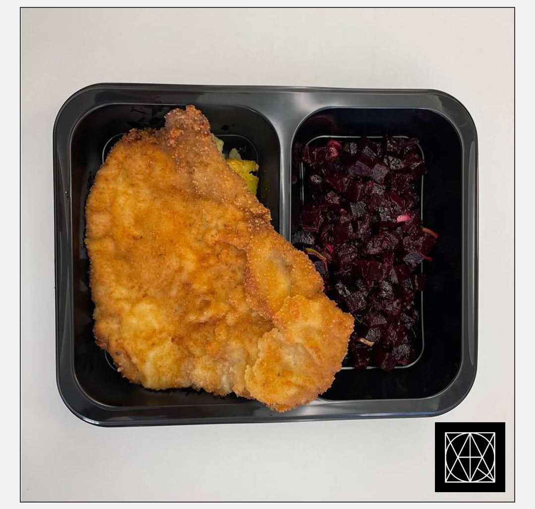 Vienos šnicelis iš kiaulienos, pateikiamas su keptomis bulvėmis ir burokėlių salotomis