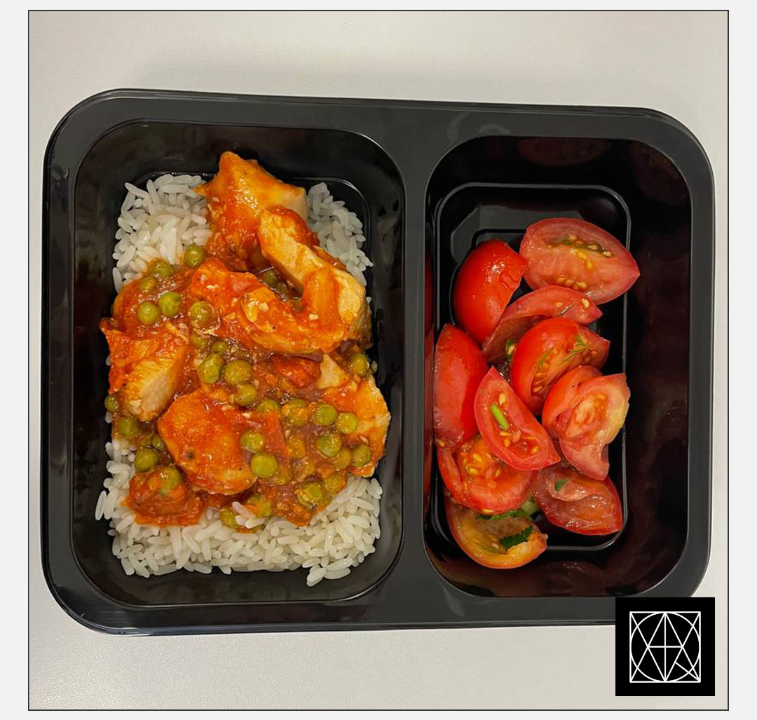 Vištiena „Vyšnia“ su žirneliais, pateikiama su basmati ryžiais ir pomidorų kapotiniu