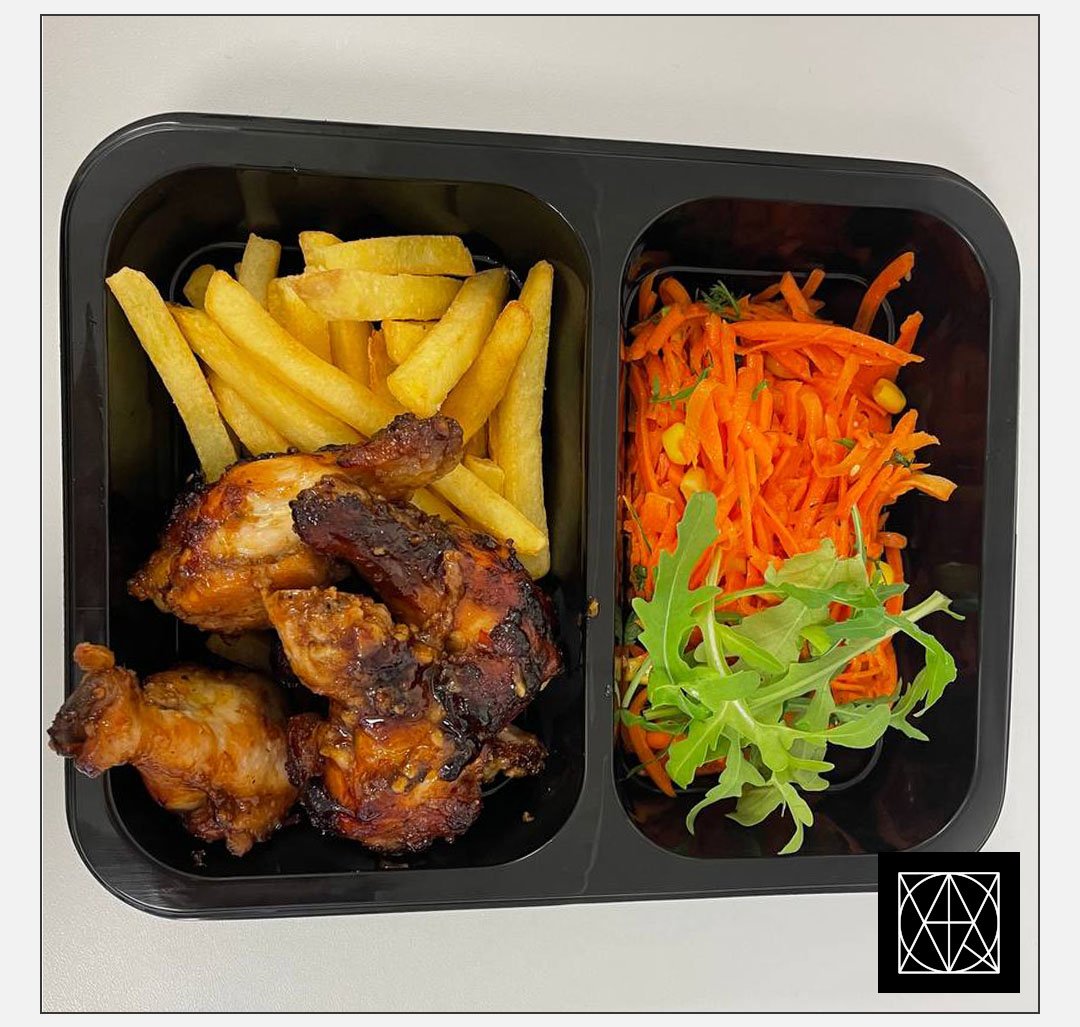 Vištienos „Buffalo“ sparneliai su gruzdintomis bulvytėmis ir morkų salotomis