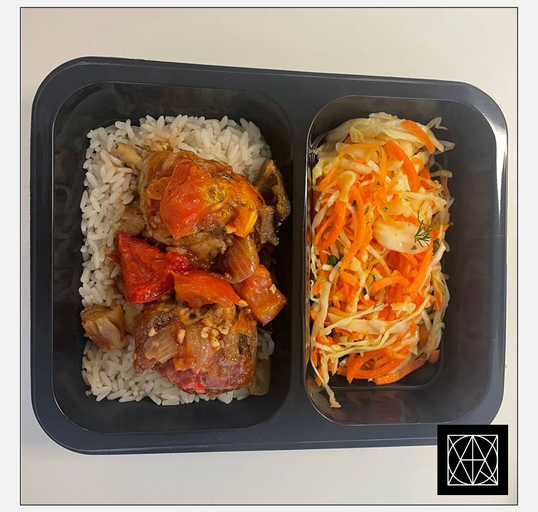 produkto kiekis: Vištienos „Čakobili“, pateikiamas su ryžiais ir marinuotų morkų-kopūstų salotomis