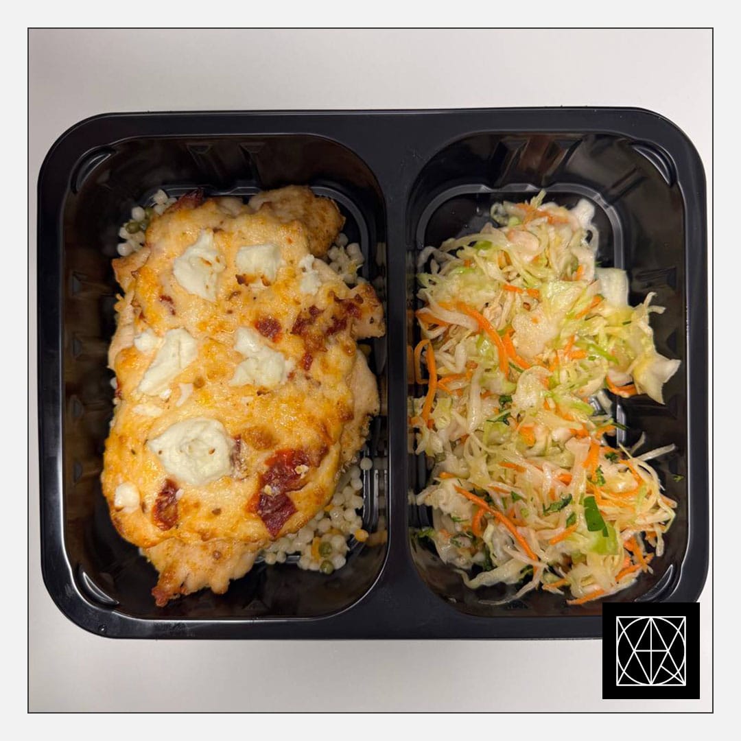 Vištienos filė, užkepta džiovintais pomidorais ir feta, pateikiama su kuskusu ir šviežių kopūstų salotomis
