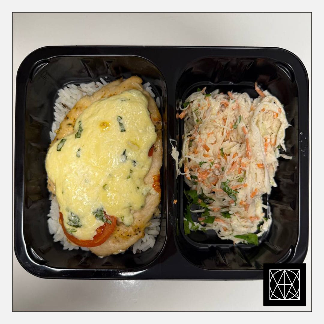produkto kiekis: Vištienos filė, užkepta pomidorais, bazilikais ir sūriu, pateikiama su laukiniais ryžiais ir kopūstų salotomis, gardintomis majonezu