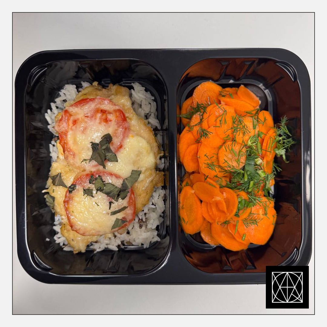 Vištienos filė, užkepta pomidorais, bazilikais ir sūriu, pateikiama su laukiniais ryžiais ir morkų griežinėliais