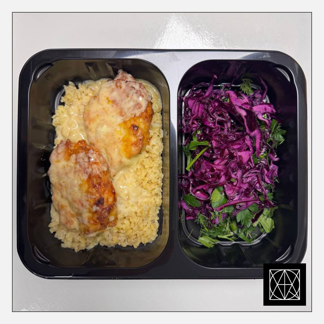 Vištienos kapotukai su morkomis ir svogūnais, pateikiami su bulguro rizotu ir mėlynųjų kopūstų salotomis