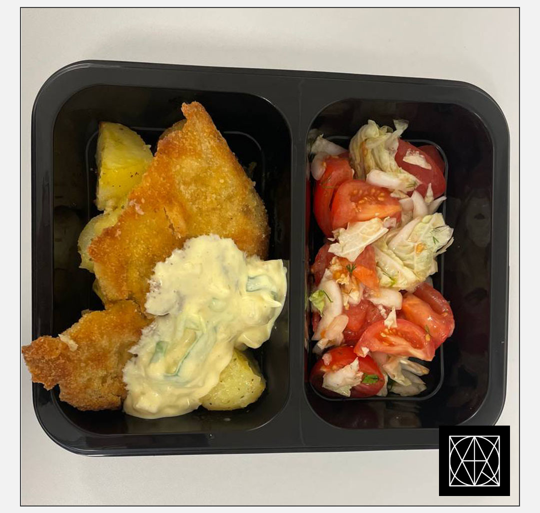 Vištienos karbonadas su havajietišku padažu, pateikiamas su keptomis bulvėmis ir pomidorų kapotiniu