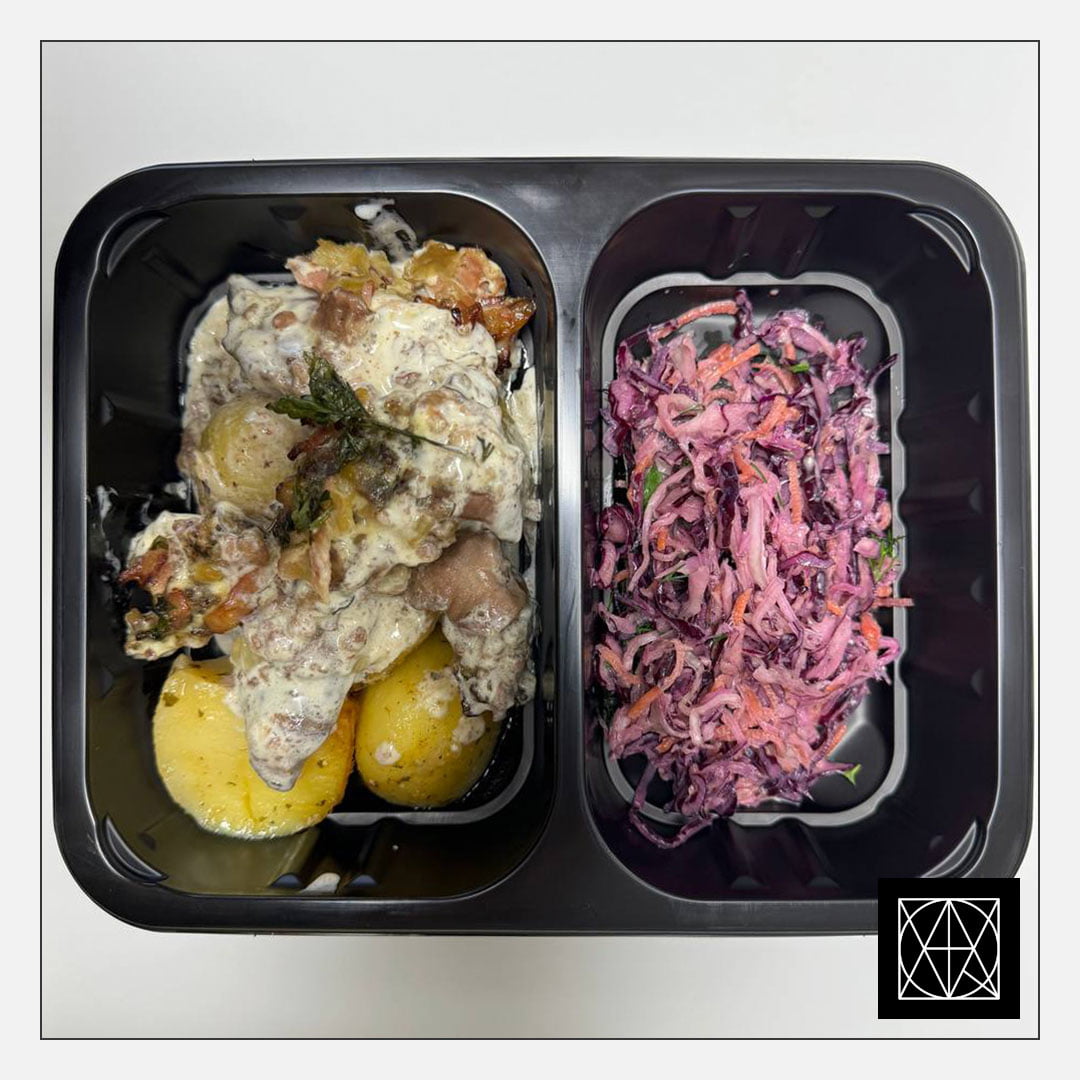 Vištienos kepenėlių troškinys su svogūnais, rūkyta šonine ir grietinėlės padažu, pateikiamas su keptomis česnakinėmis bulvėmis ir „Coleslaw“ salotomis