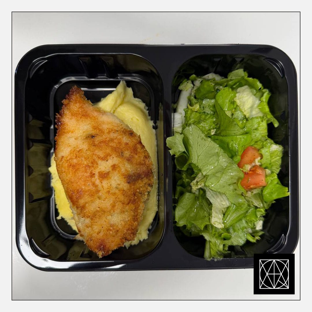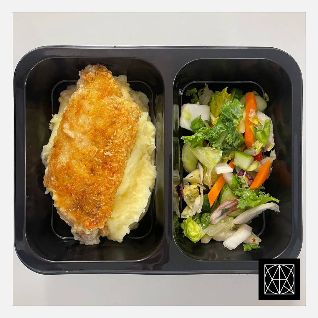 produkto kiekis: Vištienos kepsnys „Cordon bleu“, įdarytas su kumpiu ir sūriu, pateikiamas su sviestine bulvių koše ir šviežiomis salotomis
