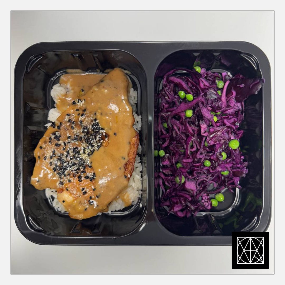 Vištienos kepsnys su teriyaki padažu ir sezamais, pateikiamas su ryžiais ir mėlynųjų kopūstų salotomis, gardintomis žirneliais