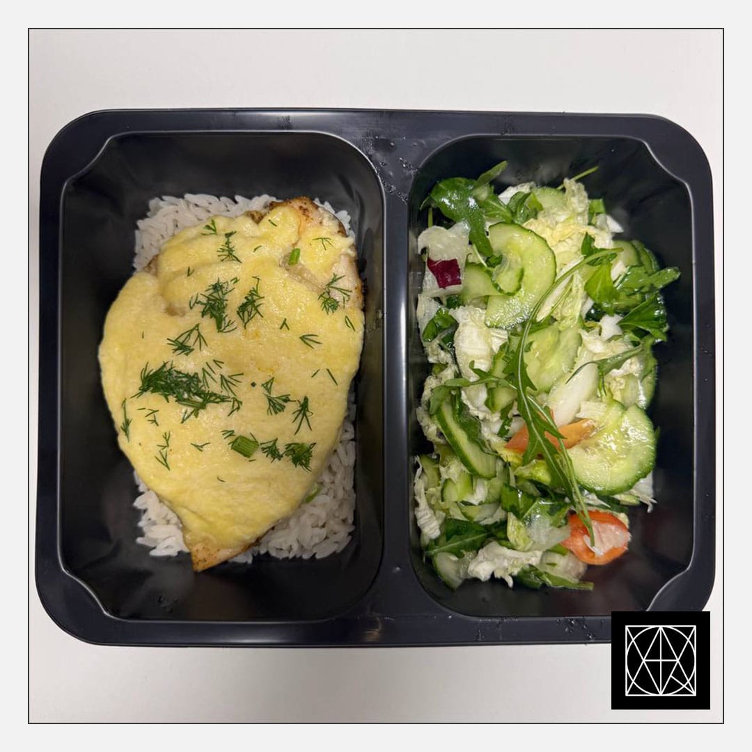 produkto kiekis: Vištiena, užkepta konservuotais ananasais ir sūriu, pateikiama su ryžiais ir šviežiomis salotomis