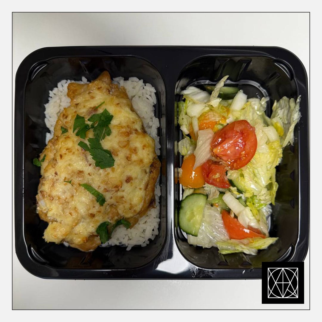 Vištienos kepsnys, užkeptas migdolų drožlėmis ir sūriu, pateikiamas su ryžiais ir šviežiomis salotomis