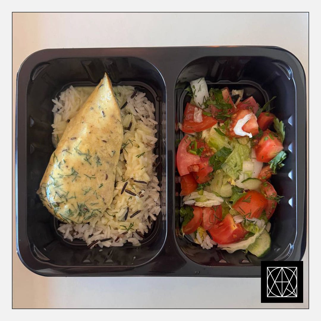 Vištienos krūtinėlė, gardinta kario padažu ir žalumynais, pateikiama su laukiniais ryžiais ir šviežiomis salotomis