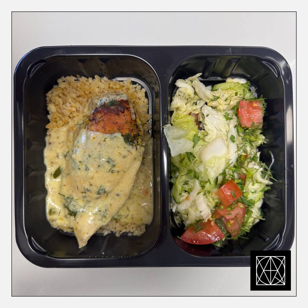 produkto kiekis: Vištienos krūtinėlė, įdaryta daržovėmis ir sūriu, pateikiama su bulguru ir šviežiomis salotomis