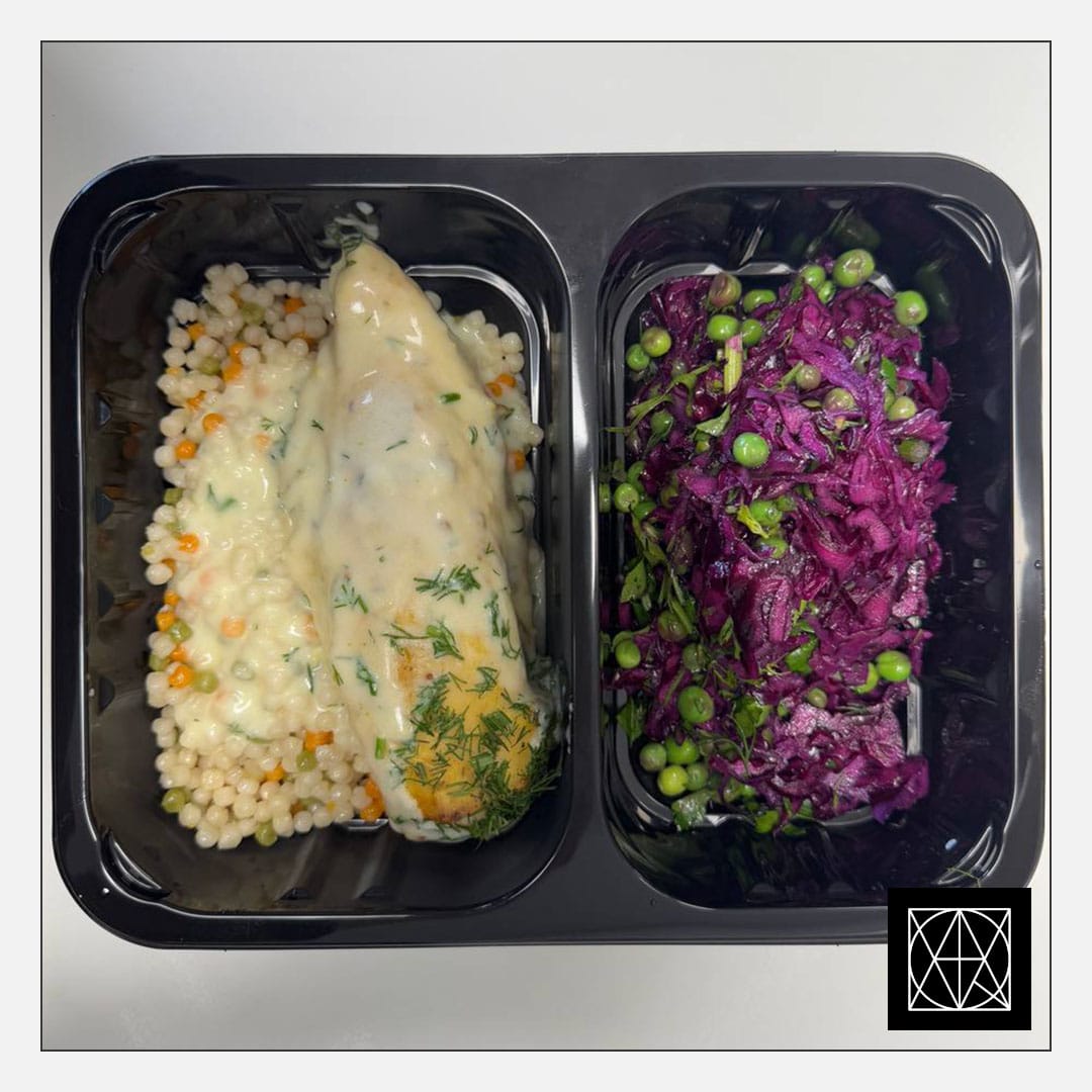 Vištienos krūtinėlė, įdaryta saulėje džiovintais pomidorais ir špinatais, gardinta kreminiu padažu, pateikiama su kuskusu ir mėlynųjų kopūstų salotomis, gardintomis žirneliais