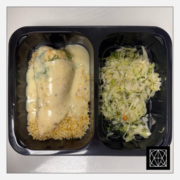 Vištienos krūtinėlė, įdaryta špinatais ir saulėje džiovintais pomidorais, pateikiama su bulguru ir šviežių kopūstų salotomis, gardintomis krapais