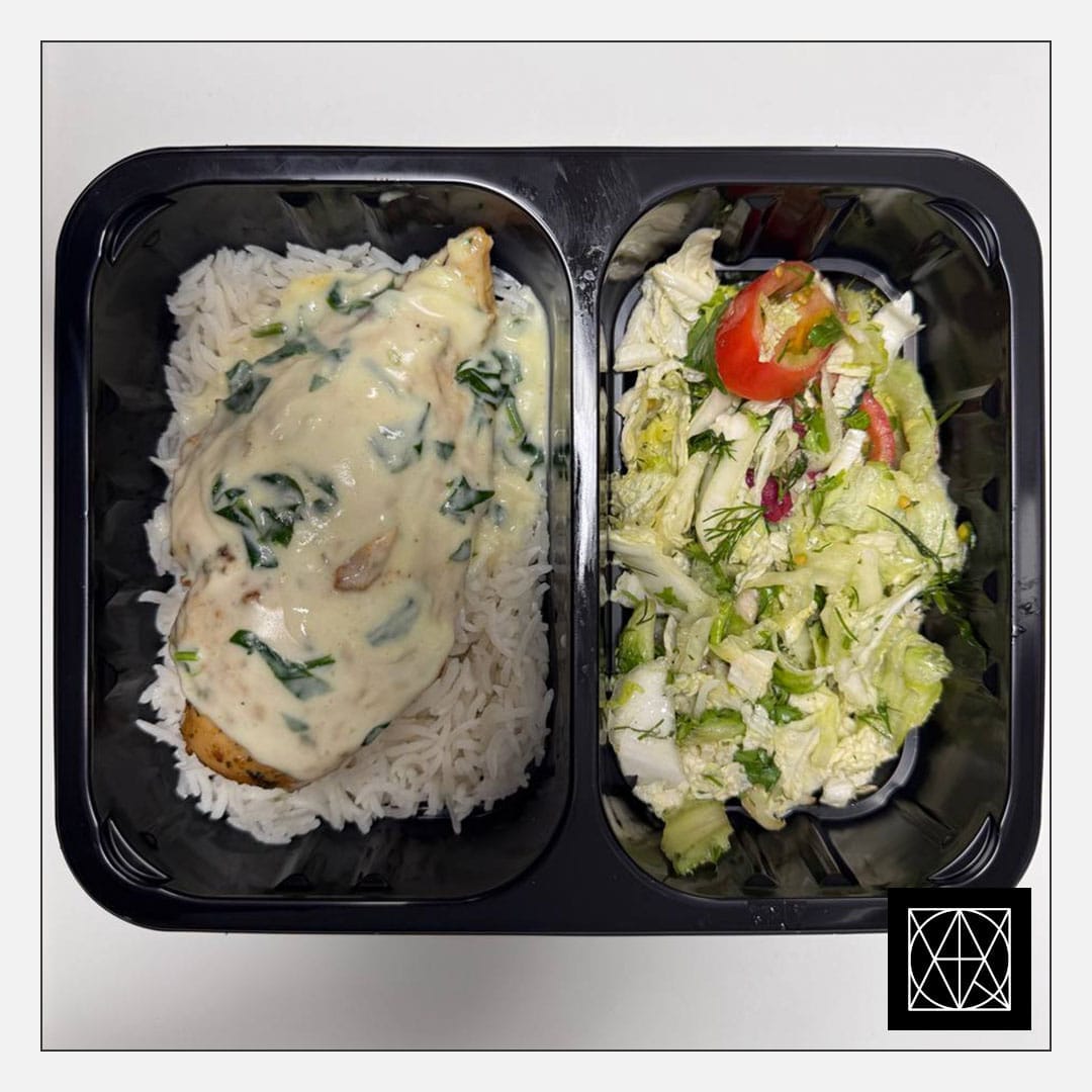 produkto kiekis: Vištienos krūtinėlė su špinatų padažu, pateikiama su basmati ryžiais ir šviežiomis salotomis